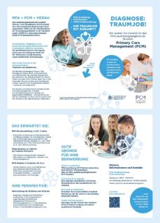 Hier finden Sie alle Materialien zur Einstellung von Auszubildenden zur Medizinischen Fachangestellten (MFA) mit ausbildungsbegleitendem Bachelor-Studium Primary Care Management (PCM) sowie Praxisposter, PCM-Flyer und mehr: